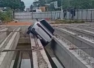 Carro invade obra e cai em estrutura de concreto na Autaz Mirim em Manaus