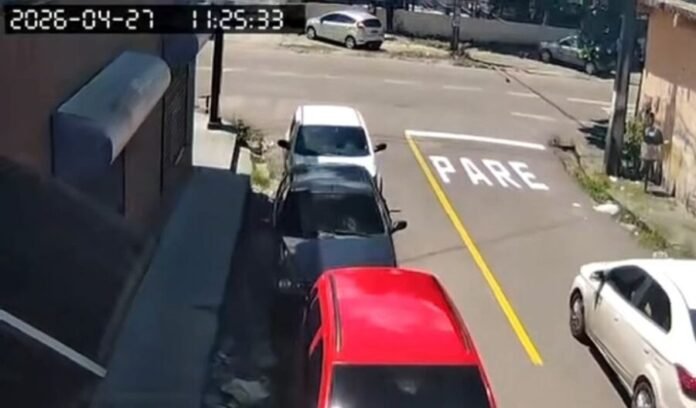 As imagens mostram a jovem caminhando com outra estudante quando um veículo, que aparenta ser um táxi, se aproxima e freia bruscamente ao lado delas.