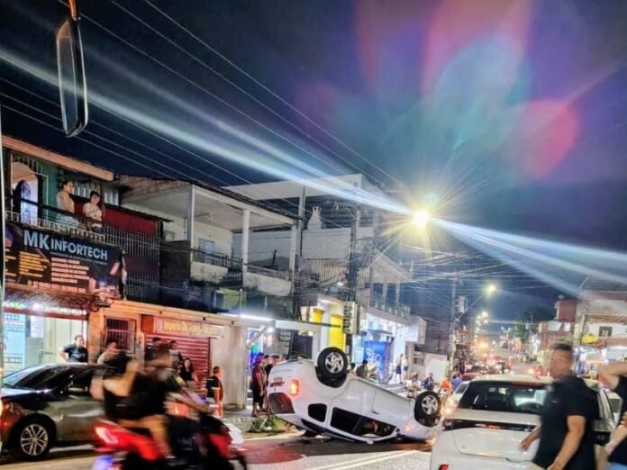 Um acidente de trânsito chamou a atenção na noite de sábado (23) na Avenida Adalberto Vale, no Betânia, Zona Sul de Manaus. Um veículo capotou na via, ficando com a parte superior completamente destruída, situação que foi registrada por moradores em vídeos compartilhados nas redes sociais.