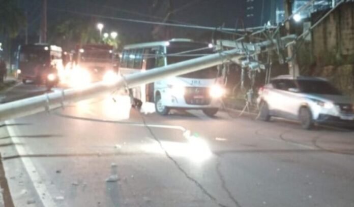Com o poste caído na pista, apenas uma faixa permanece liberada para circulação. A situação provocou congestionamento e lentidão no fluxo de veículos nas primeiras horas da manhã.