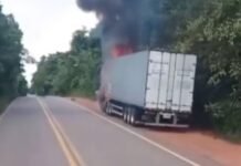 Caminhão é destruído por incêndio na BR-174 próximo à Reserva Waimiri Atroari