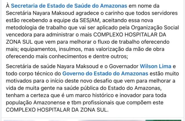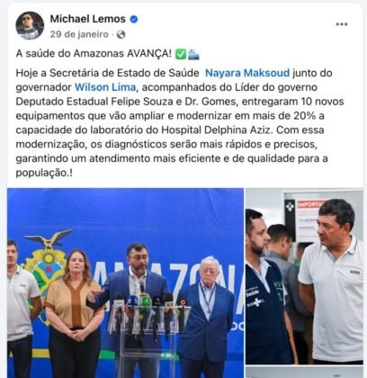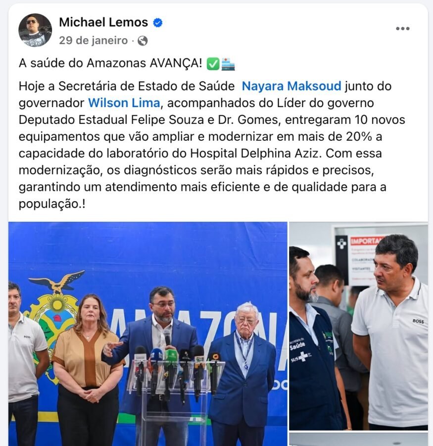 Nas publicações, ele afirmava que o Governo de Wilson Lima e a Secretária de Saúde Nayara Maksoud viviam um “momento histórico”, com mais insumos, equipamentos, medicamentos e valorização dos servidores. Também destacava a entrega de equipamentos no Delphina Aziz e apontava melhorias no atendimento, sempre atribuindo os avanços à política do Estado.