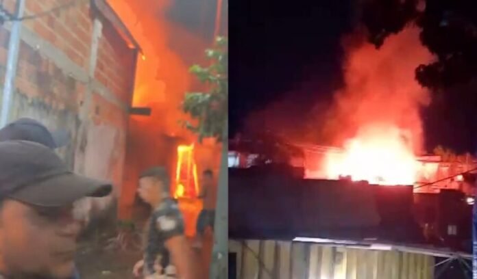 Vídeos registrados por populares mostram o momento em que o fogo se espalha pelos imóveis, enquanto moradores tentam conter as chamas com os meios disponíveis.