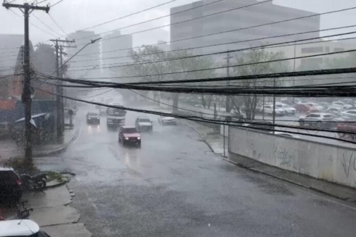 A previsão indica que as chuvas devem continuar durante todo o dia, com intensidade variável entre períodos de pancadas fortes e momentos de tempo nublado.