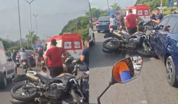 Um acidente de trânsito ocorrido nesta quinta-feira (25) deixou um motociclista ferido na Avenida Torquato Tapajós, Zona Norte de Manaus. A colisão aconteceu quando a moto foi atingida por um carro no momento em que o condutor tentava acessar a Rua Desembargador Paulo Jacob, em direção à Redenção.