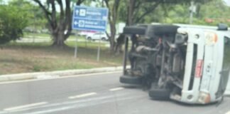 Caminhão baú capota na Avenida Santos Dumont e causa engarrafamento no...