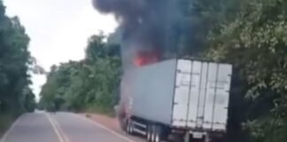 Caminhão é destruído por incêndio na BR-174 próximo à Reserva Waimiri...