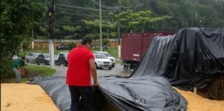 Caminhão carregado de milho tomba e complica trânsito na Avenida do...