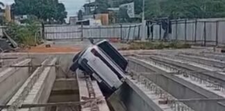 Carro invade obra e cai em estrutura de concreto na Autaz...