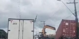 Contêiner solto de carreta bloqueia faixa e causa lentidão em Manaus