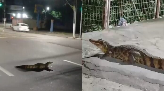 Um jacaré com cerca de 1 metro de comprimento foi flagrado atravessando a Avenida Djalma Batista, na Zona Centro-Sul de Manaus, durante a madrugada desta sexta-feira (27). A cena inusitada chamou atenção de quem passava pelo local e foi registrada por um motorista.
