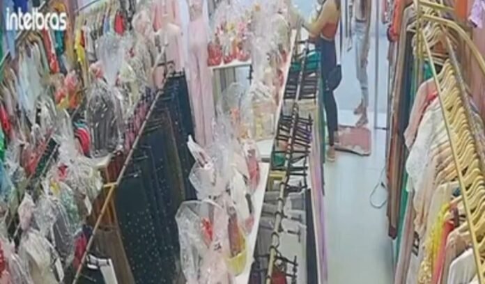 Em determinado momento, as suspeitas colocam as roupas dentro de sacolas e deixam o local sem passar pelo caixa. Toda a ação ocorre em poucos minutos.