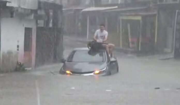 Diante da situação, o motorista subiu no teto do carro para pedir ajuda. Imagens feitas por moradores mostram o momento em que ele tenta se manter em segurança enquanto aguarda socorro.